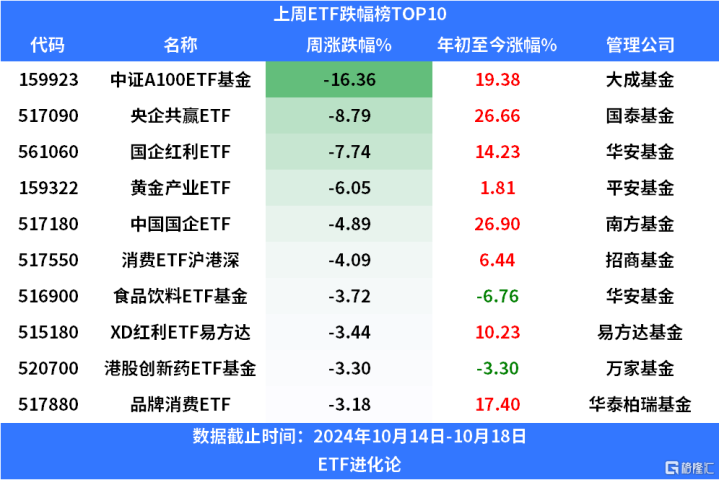 跌幅方面,高溢价的中证A100ETF基金上周连续回调,累计下跌16.36%。多只红利策略ETF跌幅居前,央企共赢ETF、国企红利ETF、中国国企ETF上周分别跌8.79%、7.74%和4.89%。