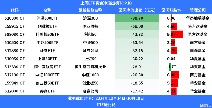 资金净流出方面,沪深300ETF上周净流出98.7亿元。