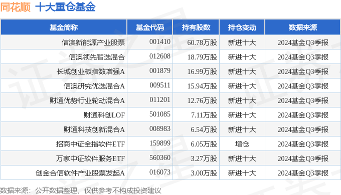持有同花顺最多的基金为信澳新能源产业股票,目前规模为66.93亿元,最新净值3.488(10月24日),较上一交易日下跌0.88%,近一年上涨10.83%。该基金现任基金经理为冯明远。
