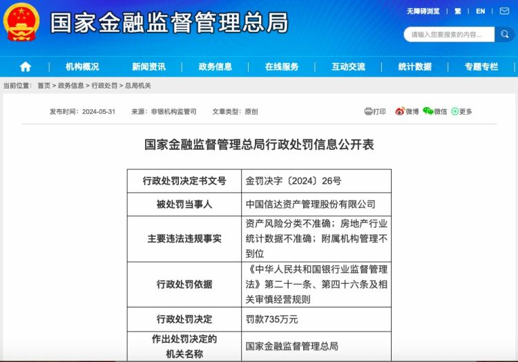 国家金融监督管理总局行政处罚信息公开表显示,中国信达因存在资产风险分类不准确、房地产行业统计数据不准确、附属机构管理不到位等三项违法违规事实,依据《中华人民共和国银行业监督管理法》第二十一条、第四十六条及相关审慎经营规则,国家金融监督管理总局决定对公司给予罚款735万元的行政处罚。据了解,这也是今年以来,AMC(资产管理公司)中被罚金额最高的一张罚单。